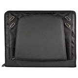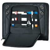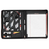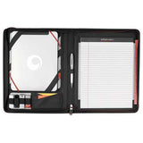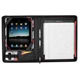 Zippered closure. Techtrap elastic interior organizer. Holds a 10" tablet. Front cover access pocket with business card holders and media organizers. 4 USB memory flash drive holders. 2 business card holders. Elastic pen loop. Gusseted document pocket. Includes 8.5" x 11" elleven™ series writing pad.